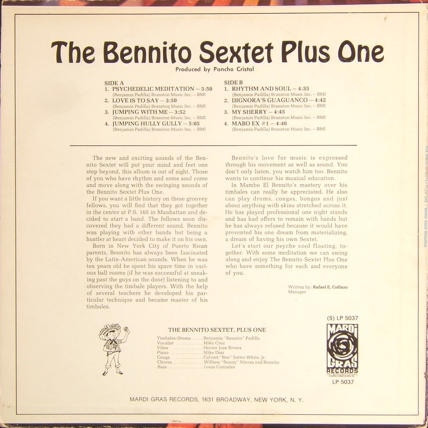 'The new & exciting sounds of the Bennito Sextet will put your mind & feet one step beyond. This album is out of sight. Those of you who have rhythm & some soul come & move along with the swingin sounds of The Bennito Sextet Plus One. If you want a history on these groovey fellows, you will find that they got together in the center at P.S. 165 in Manhattan & decided to start a band. The fellows soon discovered they had a different sound. Bennito was playing with other bands but being a hustler at heart, decided to make his own.