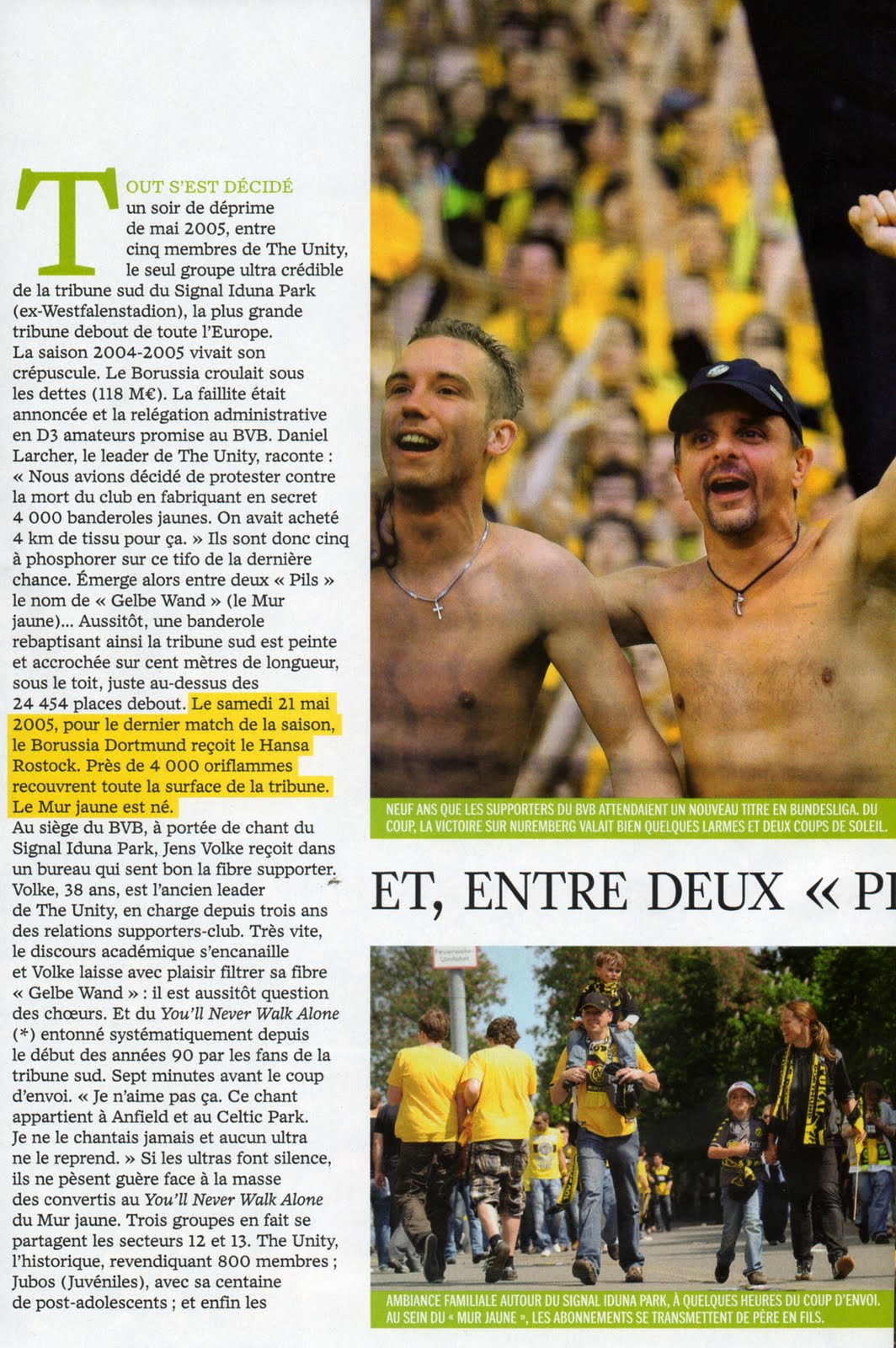 Samedi, Kevin Grosskreutz a quitté la pelouse dans un état second et le crâne à moitié rasé. Le milieu international du Borussia (22 ans, 3 sélections) avait promis de se mettre la boule à zéro pour célébrer le titre de champion d'Allemagne. Il tenait à manifester son attachement à un club dont il a toujours été un fervent supporter. Dans la folie générale d'une fin d'après-midi jaune et noir, le Brésilien Felipe Santana s'est donc procuré une petite tondeuse de coiffeur... qui est tombée en panne avant d'être venue à bout de la tignasse de l'une des révélations de l'année. À 17 h 18, la victoire du Borussia (2-0), conjuguée à la défaite de leverkusen (0-2) à Cologne, avait déclenché une immense onde de bonheur collectif. Avec huit points d'avance à deux journées de la fin du Championnat, Dort-mund a été sacré champion d'Allemagne pour la septième fois de son histoire (après 1956, 1957, 1963, 1995,1996 et 2002). Dans un stade à guichets fermés pour la douzième fois de la saison, joueurs et spectateurs ont alors longuement partagé une joie communicative. Il était 18 h 25 lorsque la fête improvisée a pris fin, avant de s'étirer bruyamment vers les rues du centre-ville, où cent mille personnes ont trinqué jusqu'au bout de la nuit.
