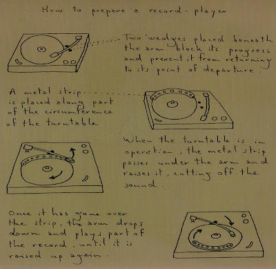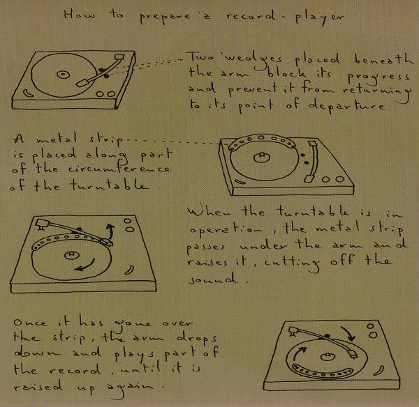 '"Musiques Paralloidres" is a sound collage that pays tribute to the record player, a portable instrument that comes complete with its own case. A few singles are subjected to cursory treatment by several turntables that have been stripped of all but their primary function, that of reading grooves. Instead of slowly spiraling inwards towards the center of the disc and the mechanism that cuts the motor, their arms ignore the laws of inertia and gravity : they rise and fall in accordance with the variety of rhythmic patterns. Of course, the records on these turntables are revolving, but not always at the right speed. And whenever they are played backwards immediately afterward.