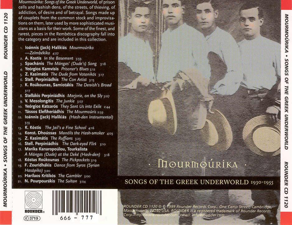 'Rebetika began on the margins of society - specifically in illegal but more or less tolerated hashish cafes - in the ports of Piraeus & Thessaloniki in the mid 1920s, as migrants, seamen and traders from the east [in particular from Turkey & Lebanon] brought their customs with them. This of course coincided with the War in Asia Minor, which displaced millions of individuals from Constantinople & Smyrna, including some of the finest musicians, effectively forcing many of them underground & into the hash dens of Greece. Fortunately, many recorded stellar 78 rpm shellac sides as well.