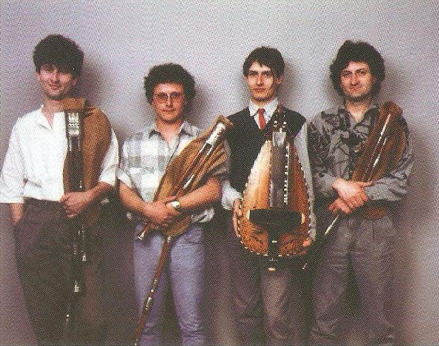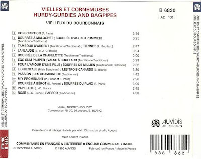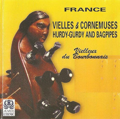 Vielles & Cornemuses by the quartet Vielleux du Bourbonnais is a very fabulous disque featuring ensemble playing of traditional French instrumental music. As one would expect from the title, the album concentrates on bagpipes and hurdy-gurdy, most of the tunes featuring both instruments with no other accompaniment. The hurdy-gurdy is a viol whose strings are sounded by means of a wooden wheel. Because of its sharp tone, and the fact that several of the strings are drones that sound continuously while the instrument plays, the hurdy-gurdy actually sounds quite similar to the bagpipe, and the two go well together. Like Café Carbons, Vielleux du Bourbonnais play their music with great respect for the melodic traditions they use. The major innovation is the use of bagpipes in several different keys to facilitate playing harmony with one another; this is standard today in French traditional musique, but was unknown 30 years ago. Vielleux du Bourbonnais infuse their musique with great energy and vitality, making 'Vielles & Cornemuses' a fresh & enjoyable album for lovers of bagpipes and hurdy-gurdies. If you don’t know much about this music, however, don’t look for help in the sleeve notes; the booklet has no information about any of the musicians or the music except a brief blurb and credits for the authors; it doesn’t even identify the members of the band.